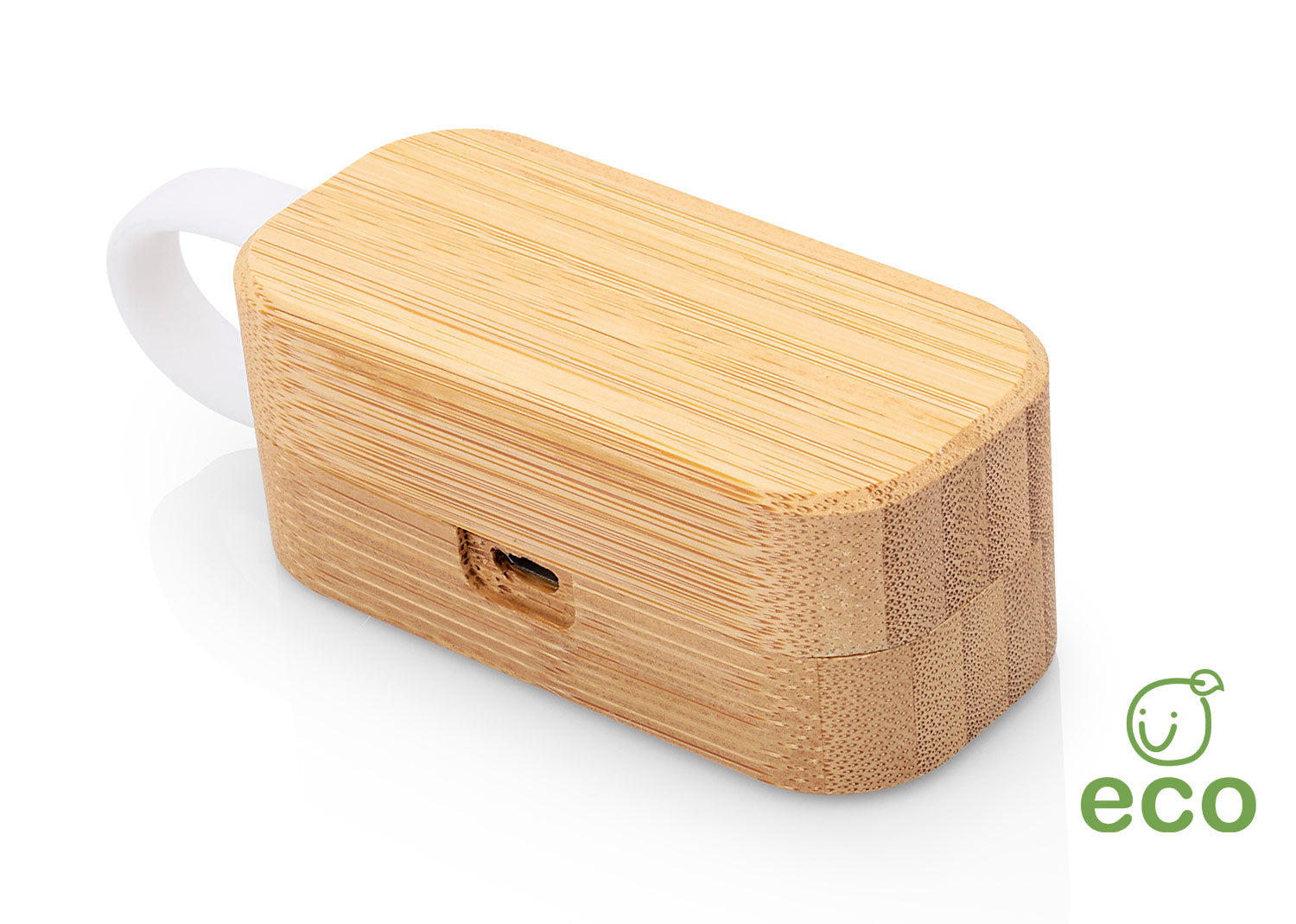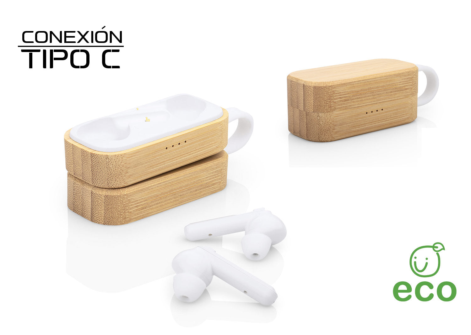Audífonos inalámbricos TWS con Bluetooth 5.0, cargador integrado en estuche de bambú con cierre imantado. Batería de 3.7V/240mA. Incluyen función de carga inalámbrica (tecnología Wireless), además de cable micro USB.