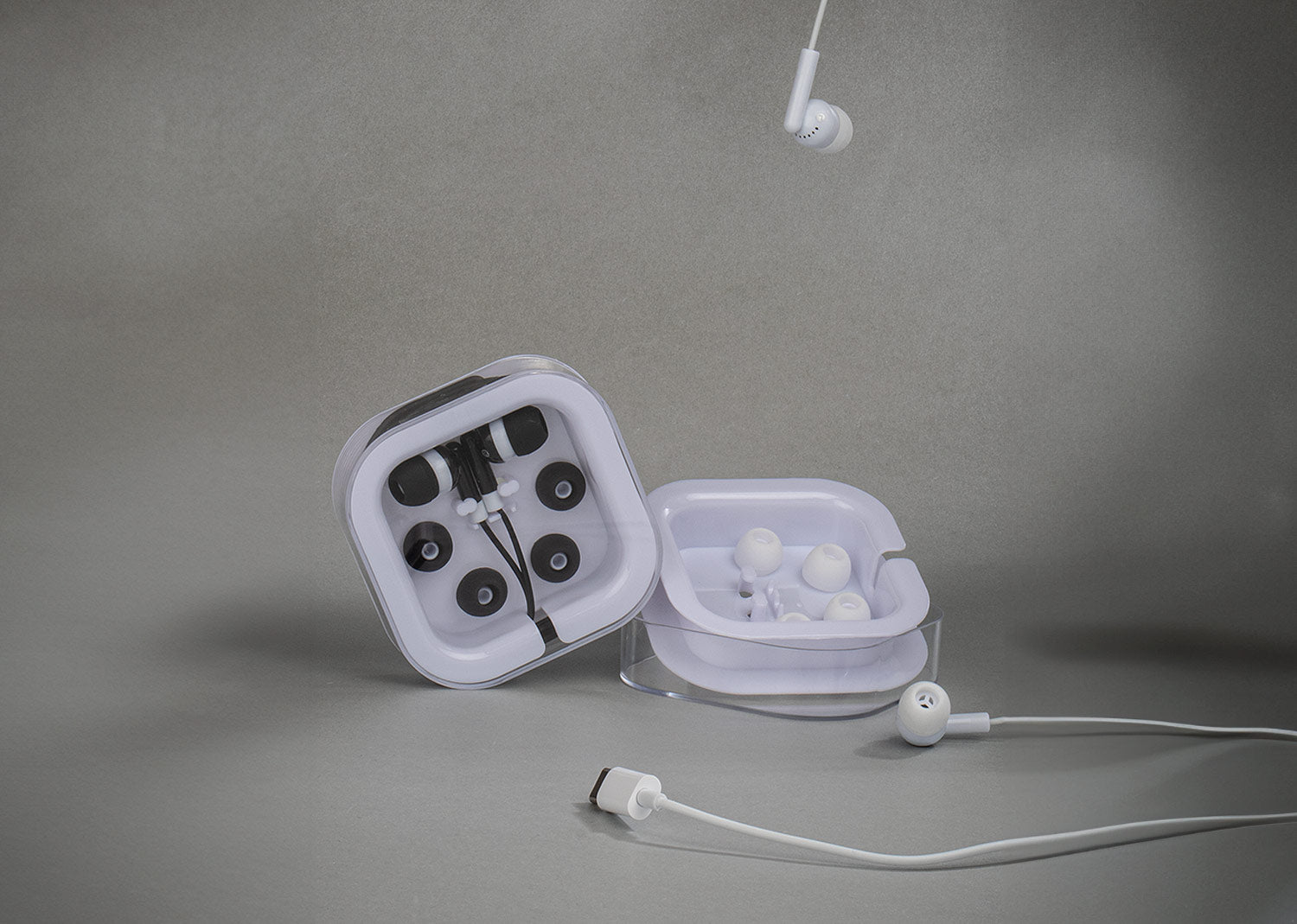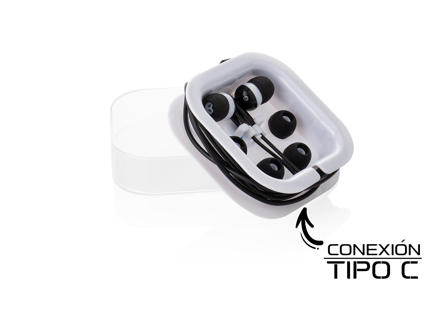 Audífonos con entrada tipo C en estuche cuadrado transparente a presión.