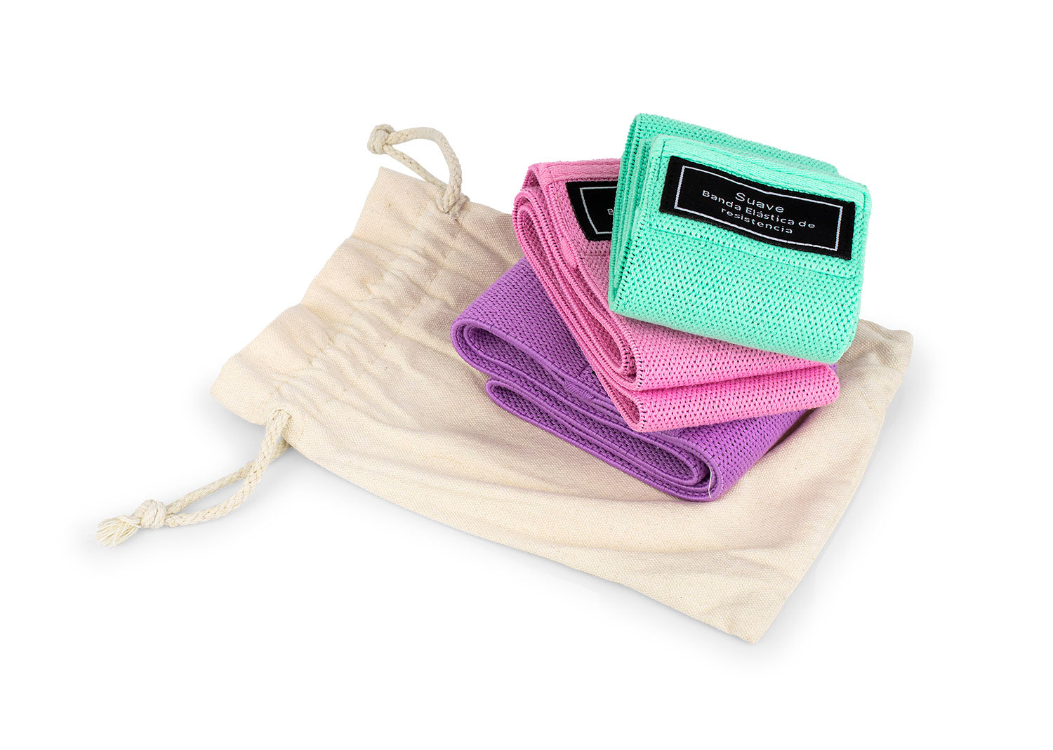 Set de 3 Bandas elásticas deportivas para trabajo funcional, en estuche algodon. Tres resistencias: Suave, Medio y Fuerte