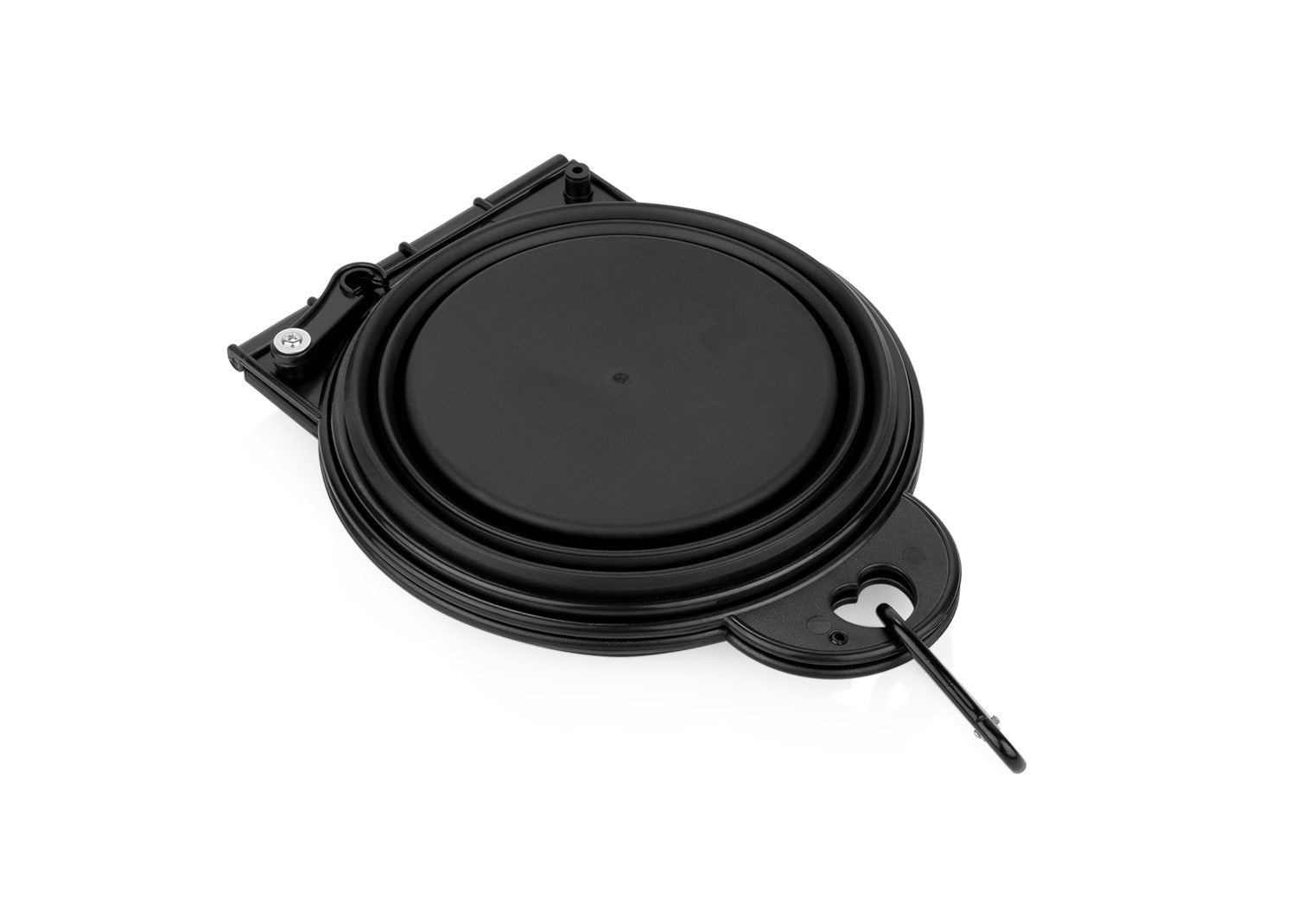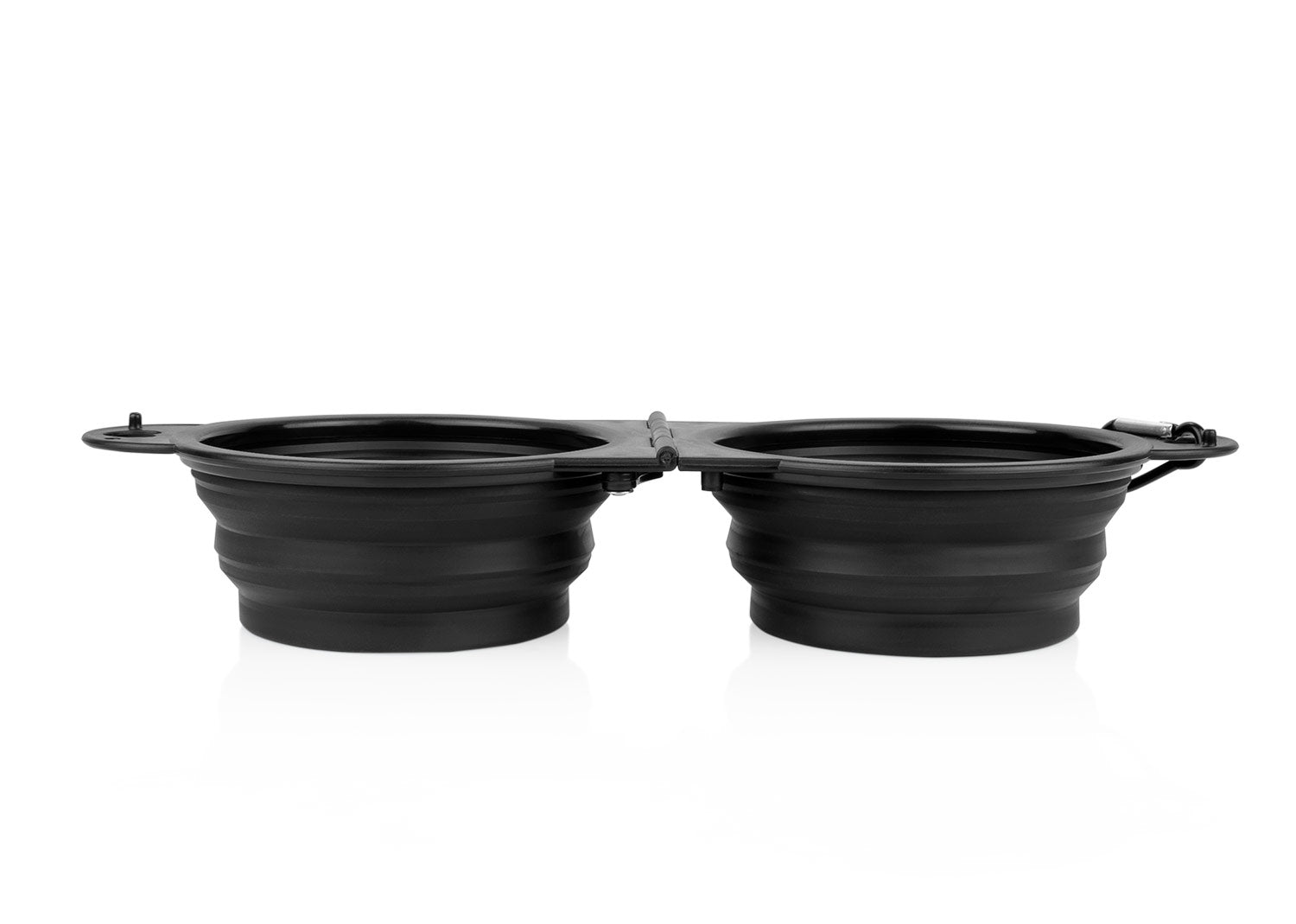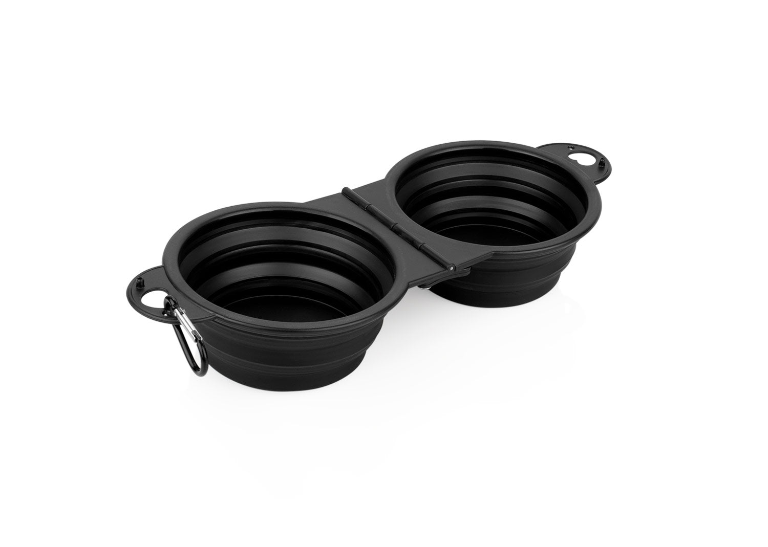 Bebedero de silicona plegable. Gracias a sus 2 compartimentos, puede ser usado para bebida y alimento simultáneamente. Es portátil e incluye gancho carabinero para transportarlo fácilmente. Además, cuenta con 2 pequeños ganchos plásticos de seguridad para evitar derrames.