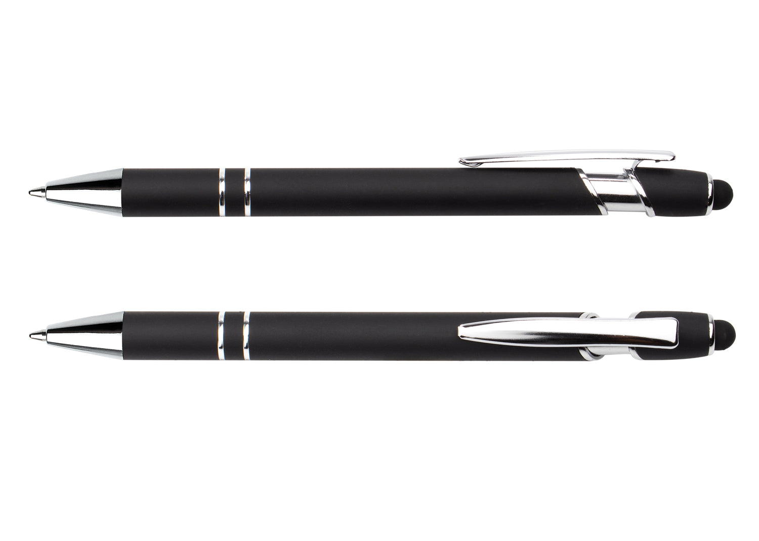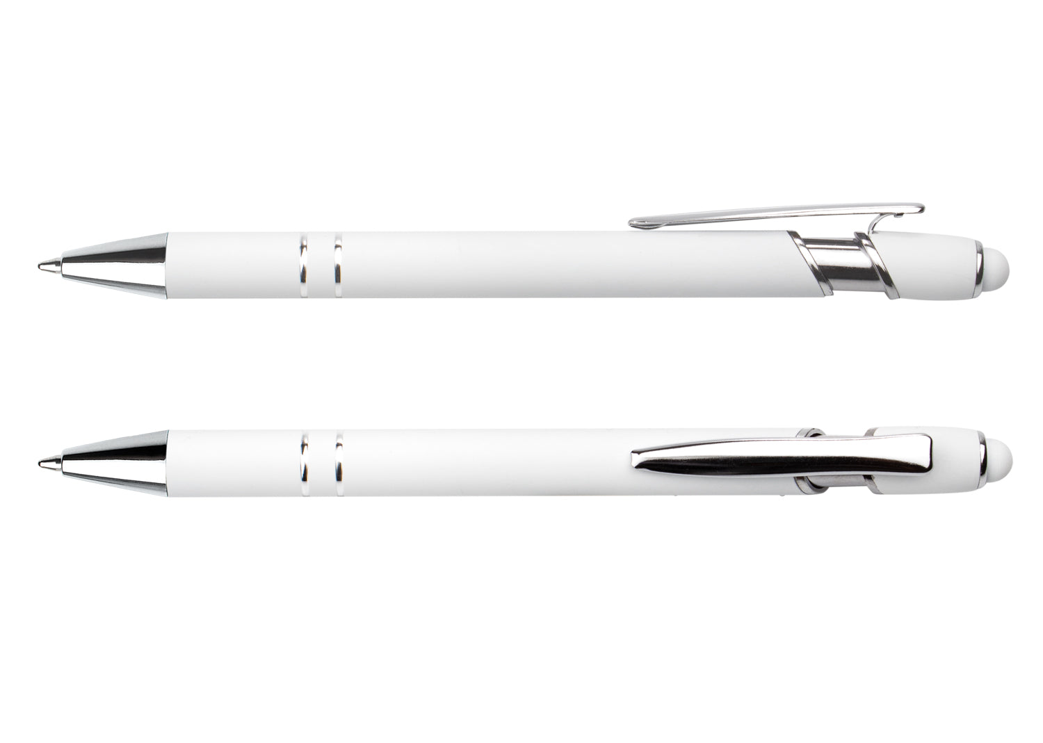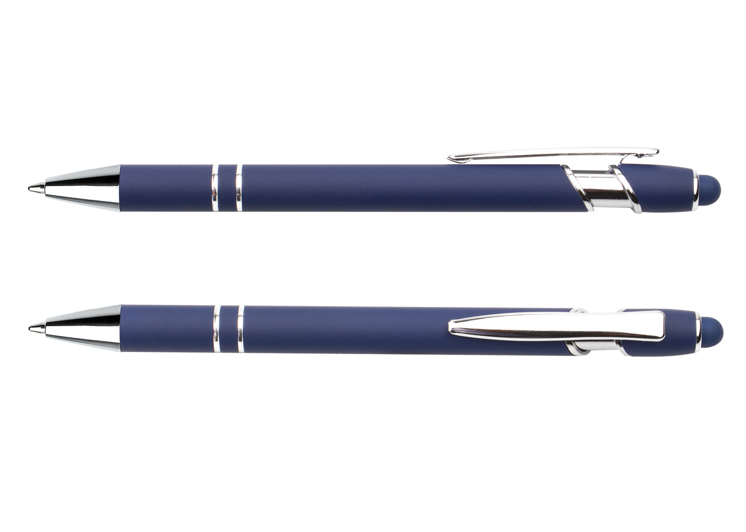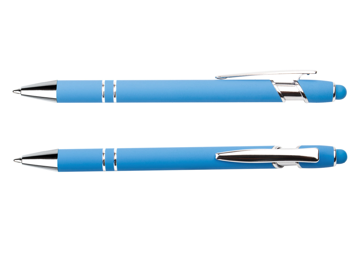Bolígrafo con cuerpo de color de goma suave, clip metálico brillante sistema de apertura retráctil.