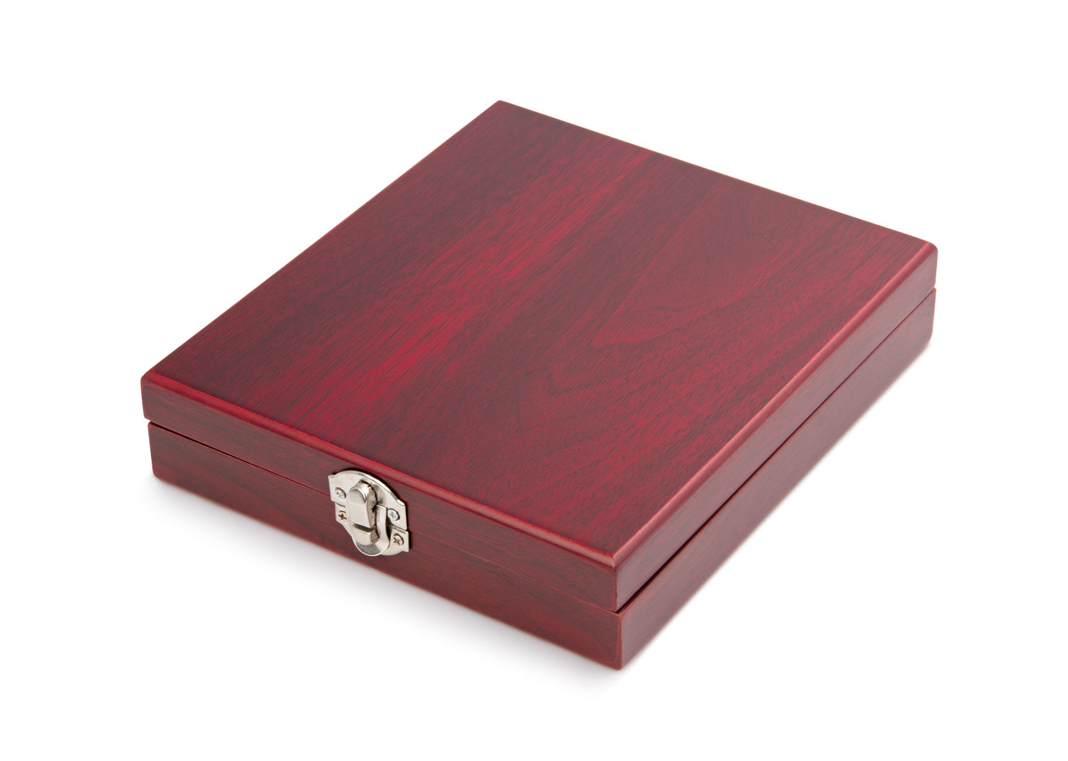 Contiene 5 accesorios con apliques en madera: Sacacorchos de un tiempo, tapón metálico, termómetro, aro antigoteo, cortagotas. Caja vinotinto con interior negro.