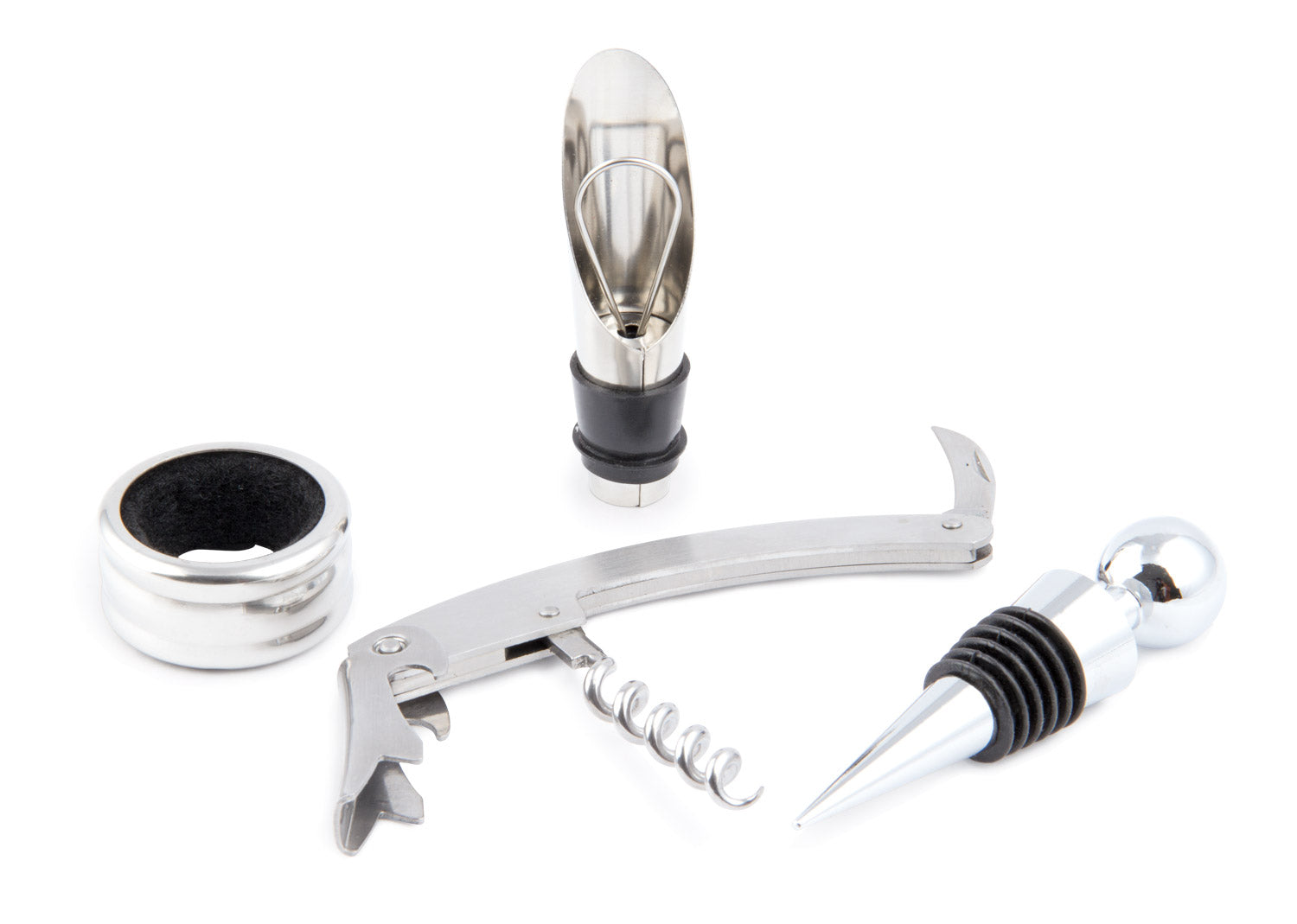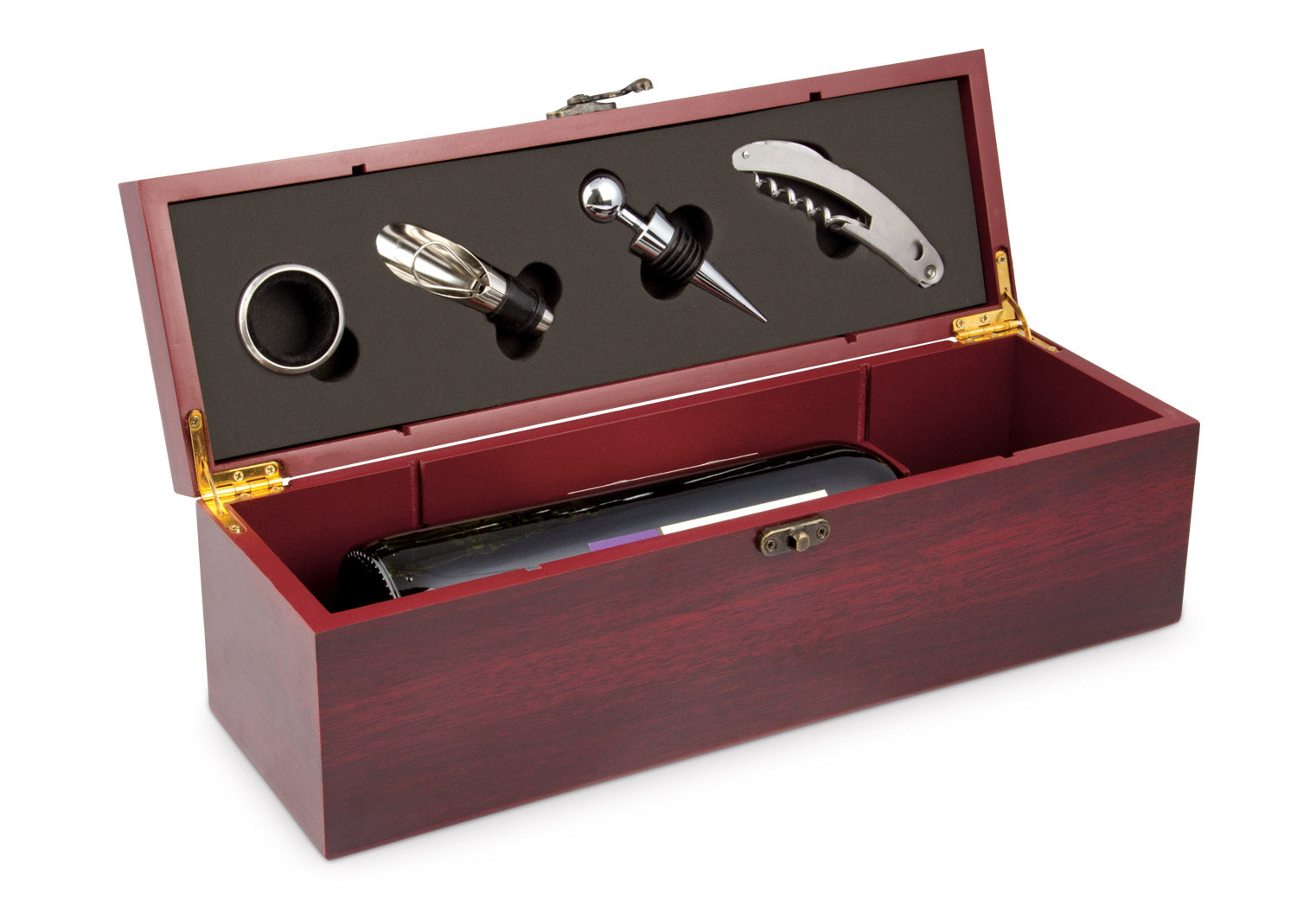 Contiene 4 accesorios de bar: Sacacorchos descapsulador de 1 tiempo, cortagotas, tapón metálico y aro antigoteo. NO INCLUYE LA BOTELLA DE VINO.