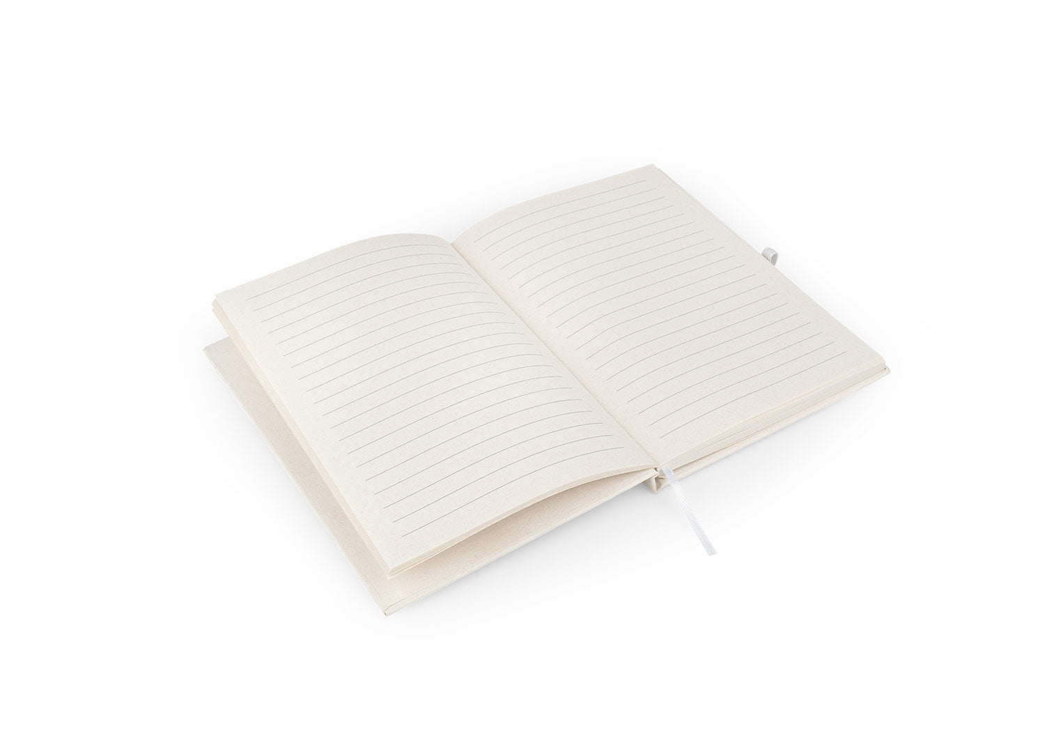 Libreta con cubierta dura y hojas elaboradas en material recuperado de cajas Tetra pak. Tiene una cinta separadora de hojas y una banda elástica para asegurar el cierre. Contiene 80 hojas rayadas de 70 g/m². Tamaño aproximado de la hoja: A6.