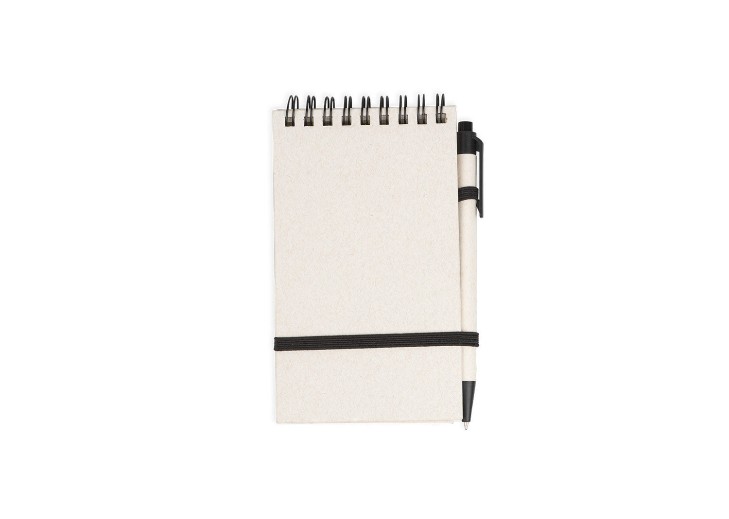 Libreta argollada 'doble O' con cubierta dura y hojas elaboradas en material recuperado de cajas Tetra pak. Banda elástica para asegurar el cierre. Contiene 70 hojas rayadas de 70 g/m². Tamaño aproximado de la hoja: A6. Incluye bolígrafo ecológico de sistema retráctil.