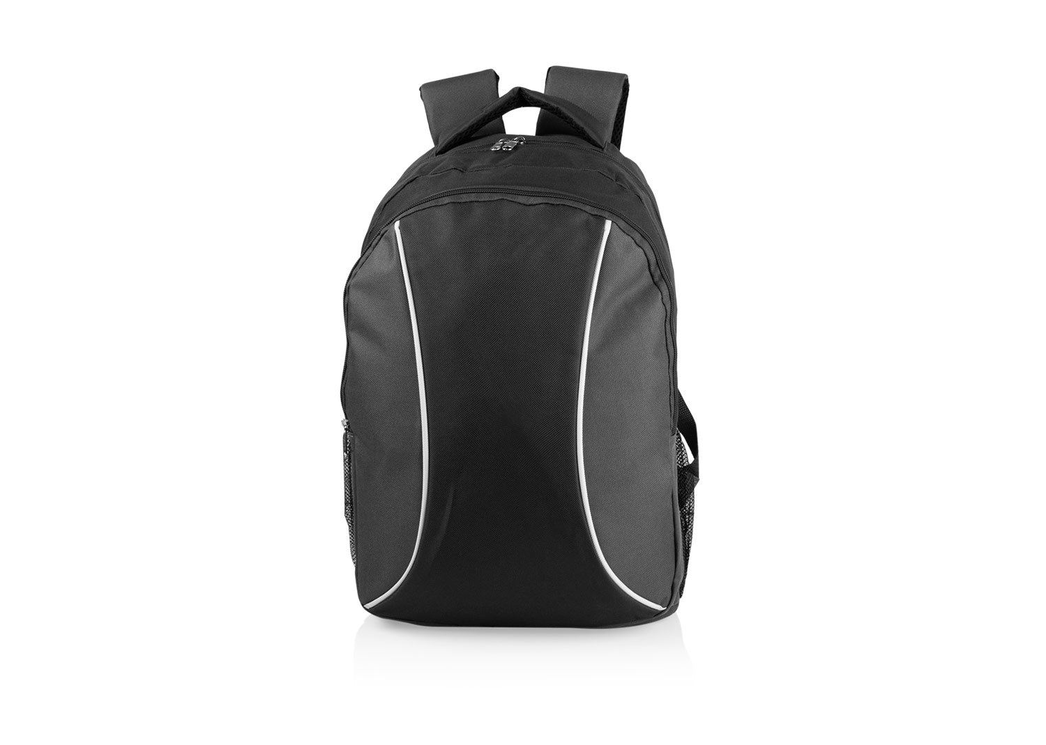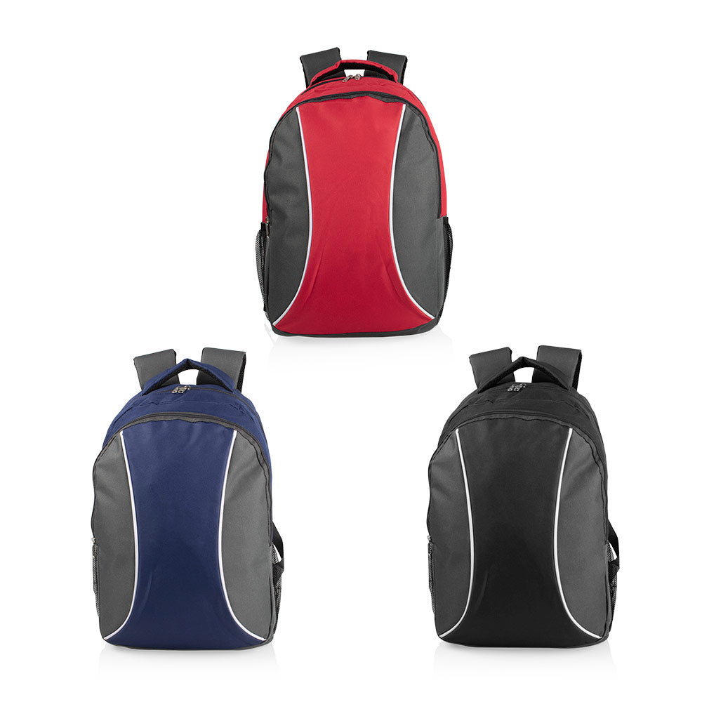 Morral con cargaderas ajustables, bolsillos principal y frontal con cremallera. Bolsillos laterales en malla, útiles para botellas. Volumen aproximado: 16 litros.