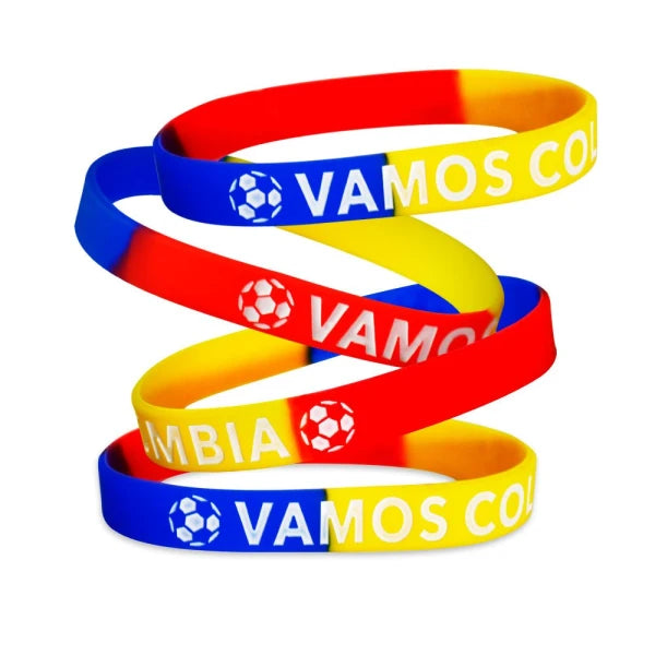 Siliconadas con la bandera de Colombia, en bajo relieve e impresión a 1 tinta. De: de 1,2 x 6,5 cm de diámetro.
