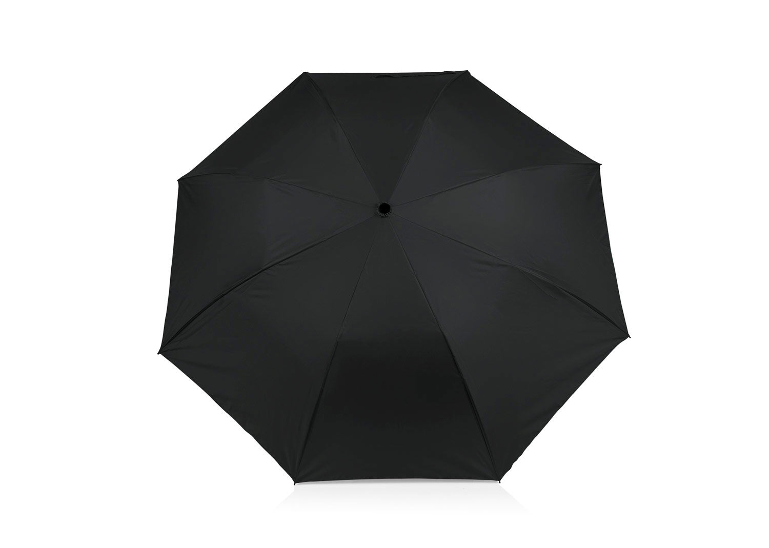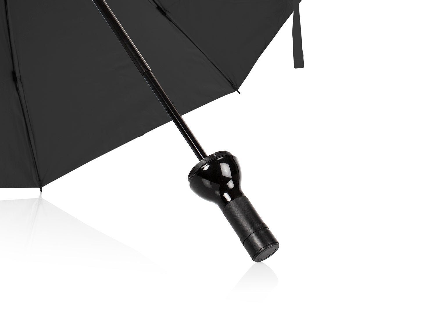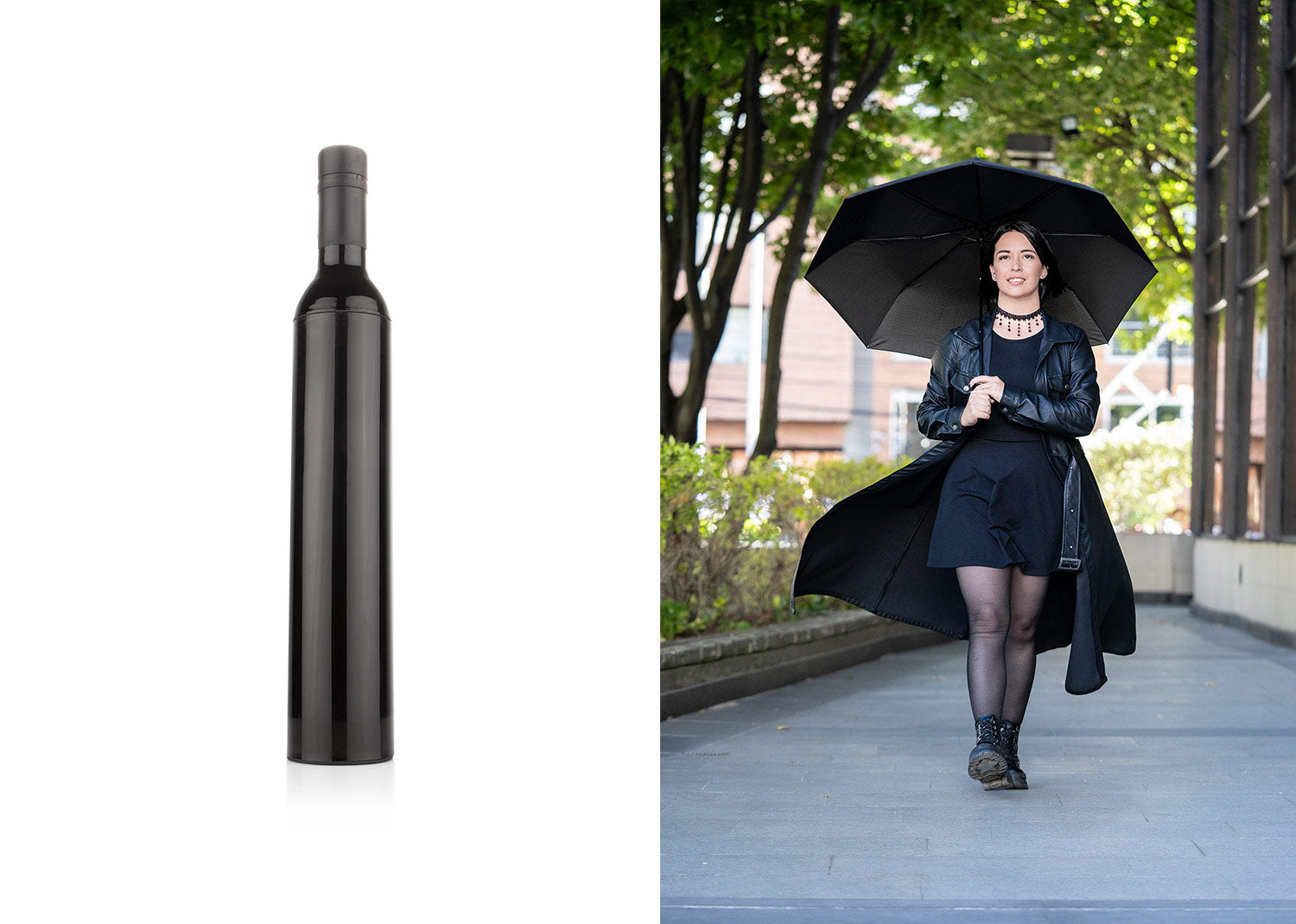 Paraguas de alta calidad confeccionado con tela Pongee 190T, con eje y varillas metálicas. Su estructura de aluminio ligero y duradero garantiza una protección confiable en días lluviosos. Incluye estuche en forma de botella.