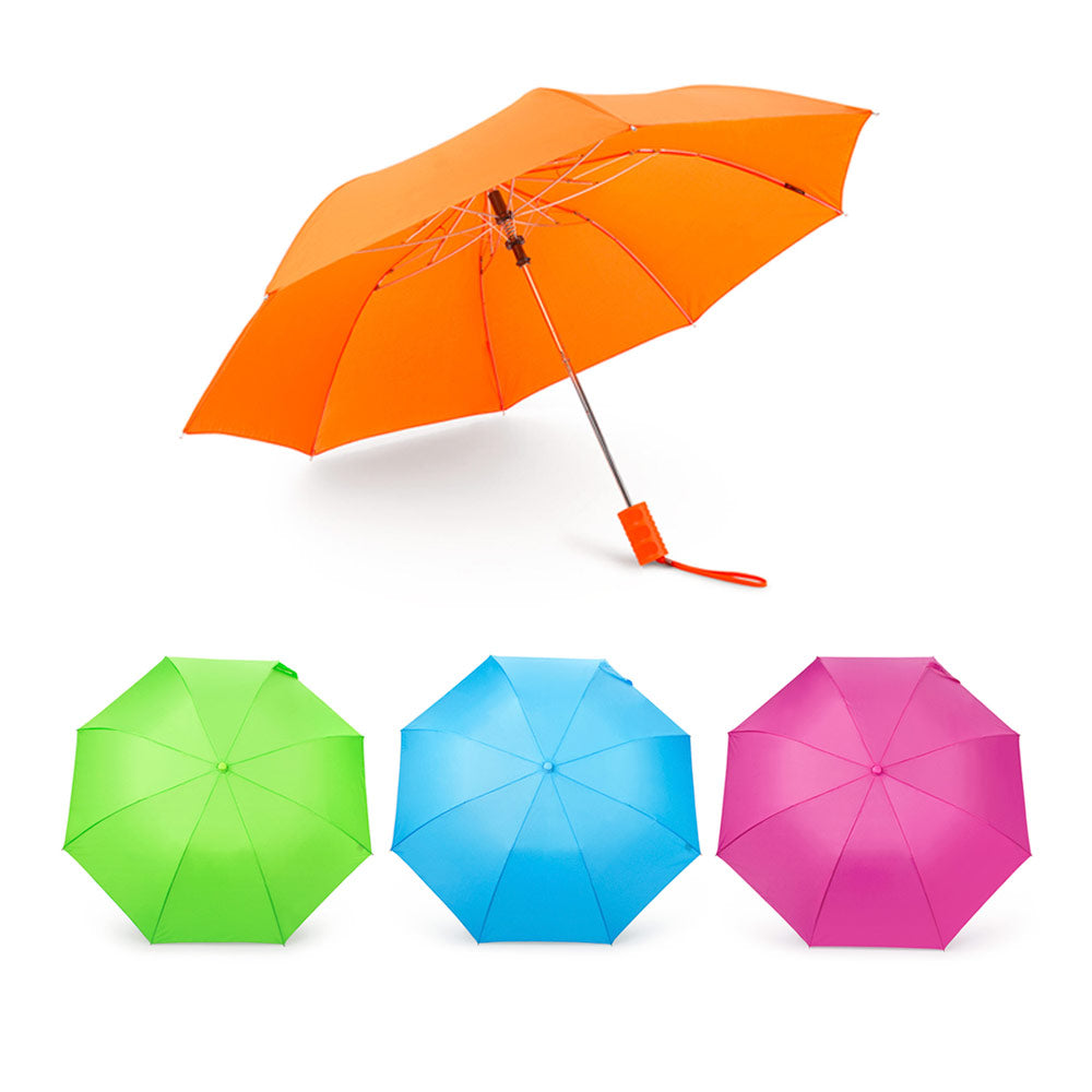 Paraguas de 21 pulgadas y 2 secciones en colores neón, con eje y varillas metálicas. Apertura automática y cierre manual. Incluye funda del mismo color del paraguas.