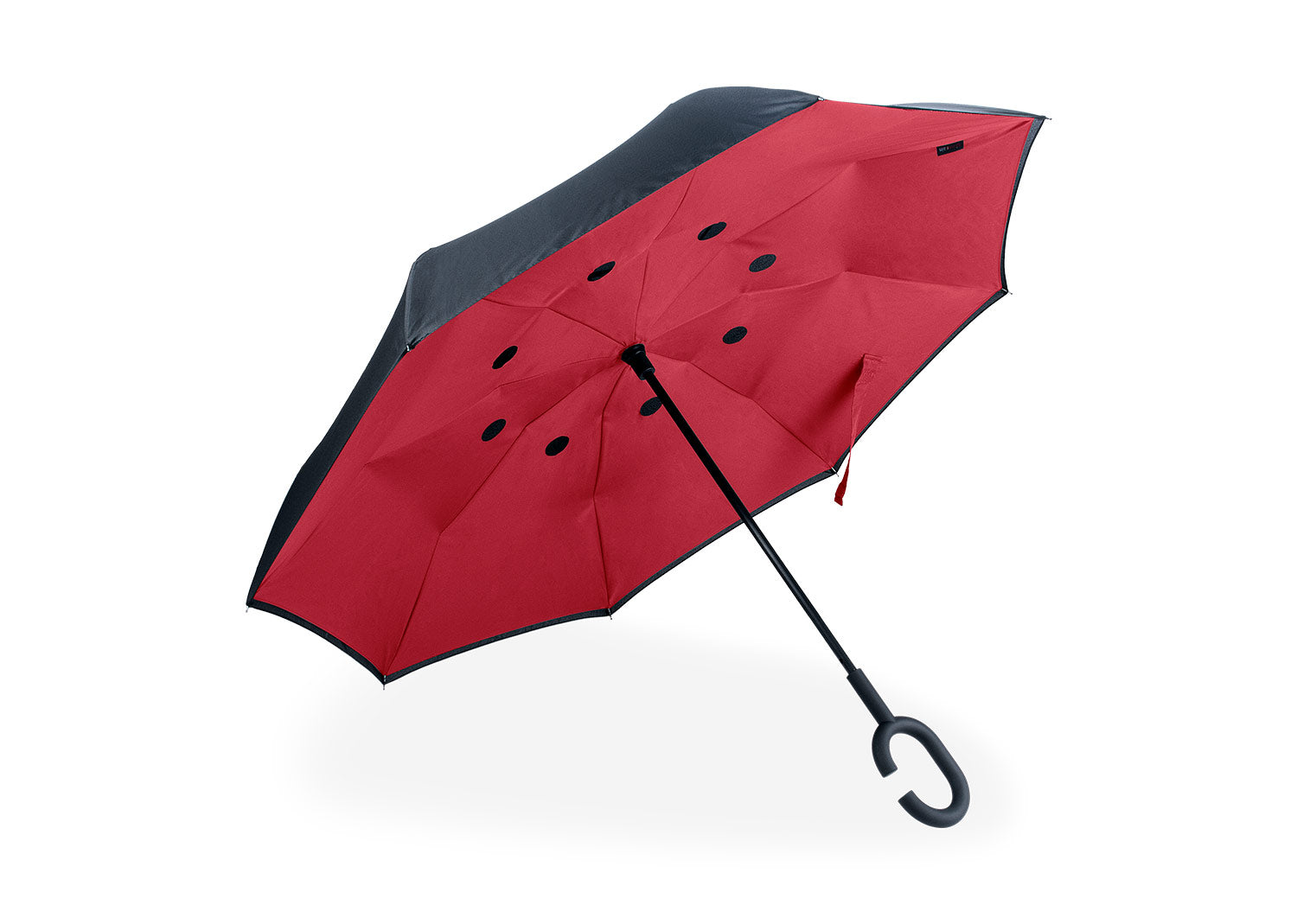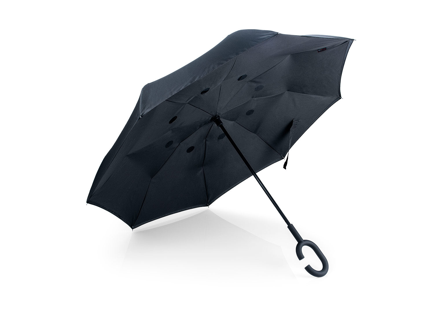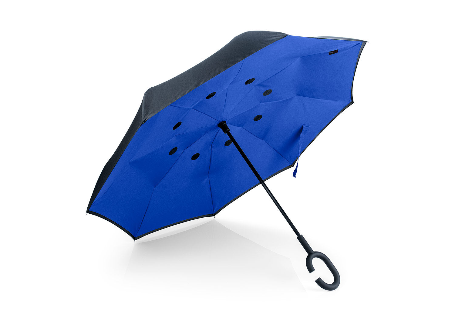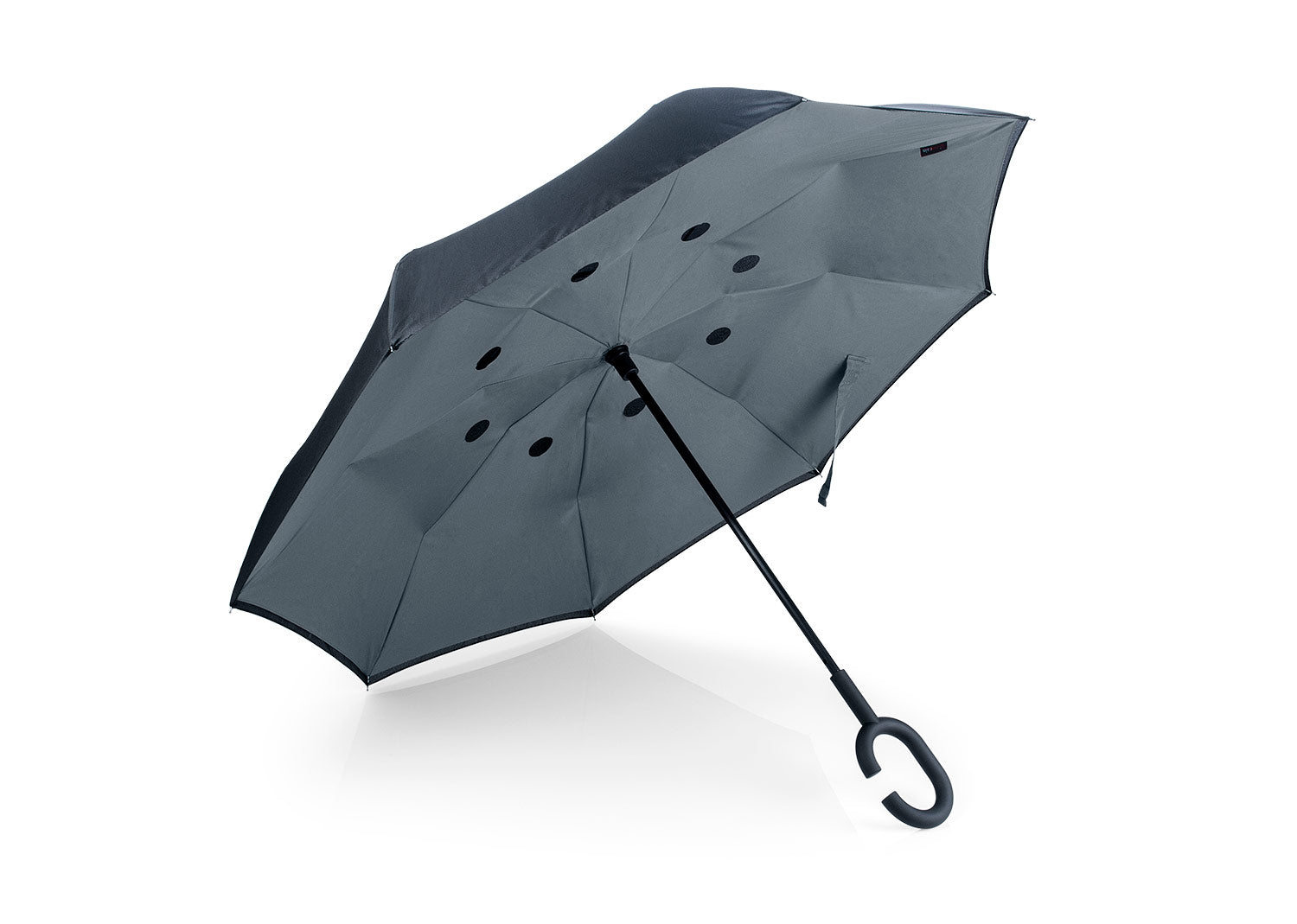 Paraguas reversible en 2 tonos con apertura automática, 8 cascos, varillas en fibra de vidrio y eje metálico. Fabricado en tela Pongee con cinta de cierre en velcro. Mango tipo C con acabado en goma que permite uso manos libres. Gracias a su mecanismo de plegado inverso, contiene el exceso de agua.