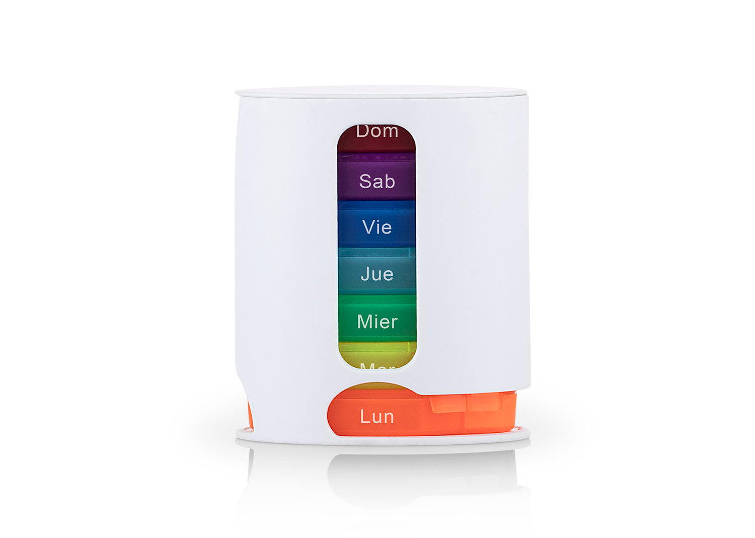 Pastillero semanal de colores con 7 compartimientos asignados para cada día de la semana. Cierre a presión.