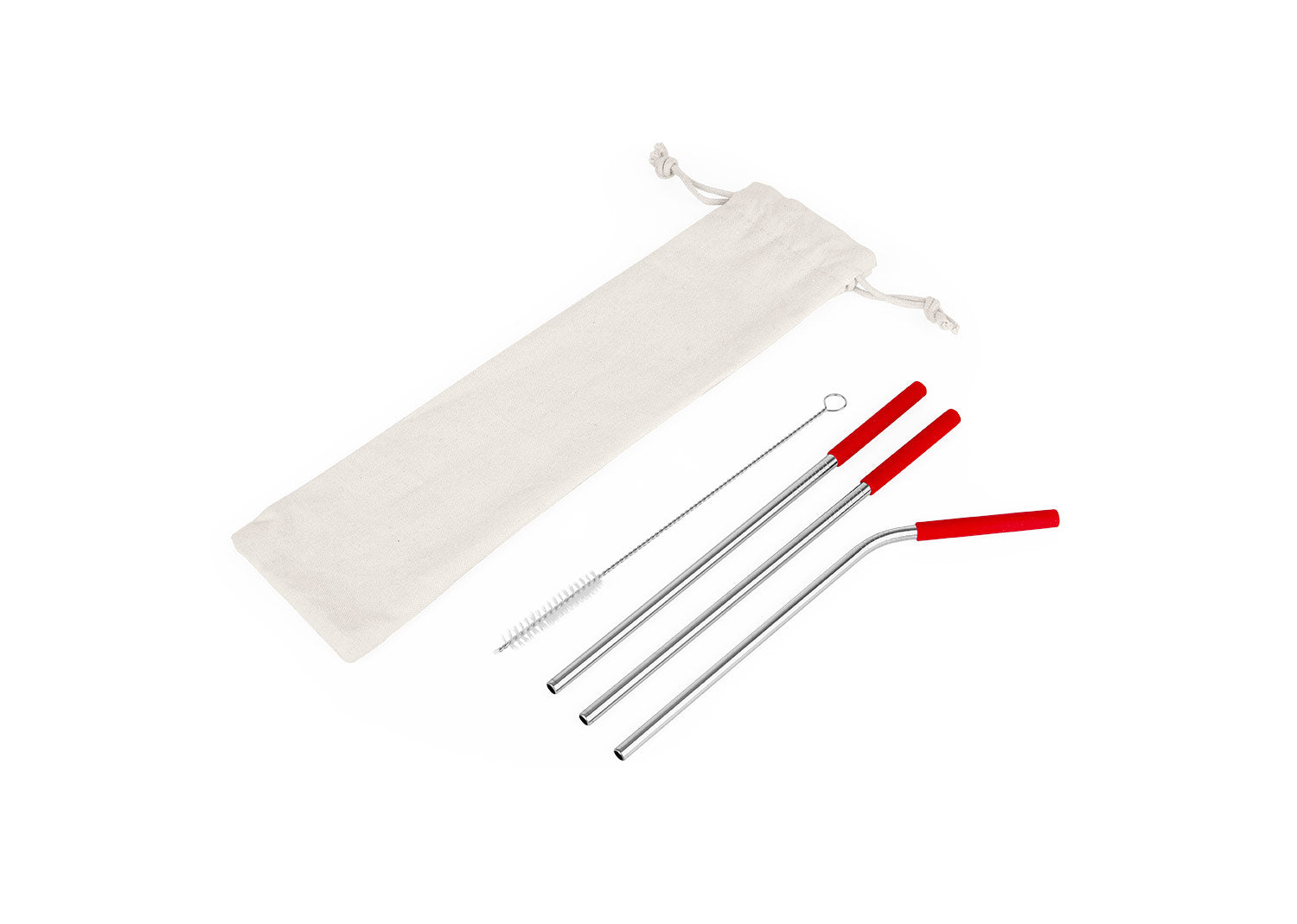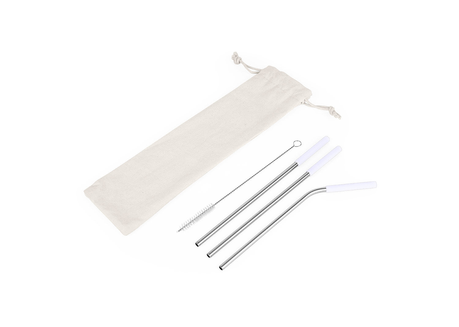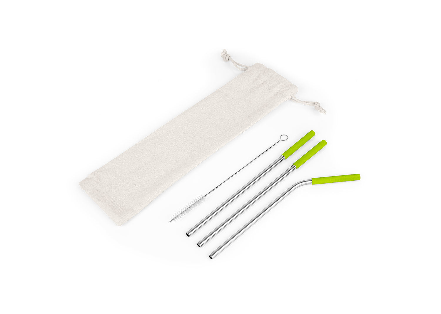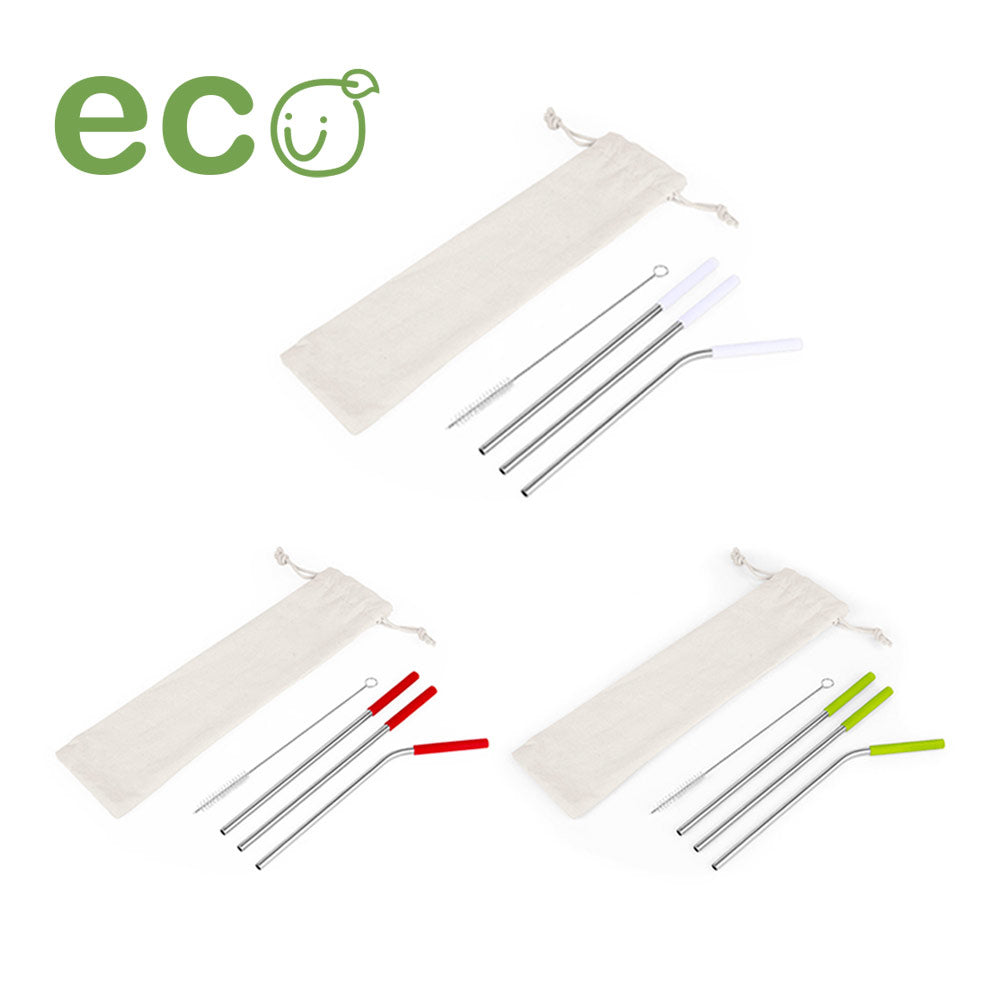 Set de pitillos ecológicos x 3 und (uno de ellos es curvo), con boquilla en silicona, cepillo para limpiarlos y estuche textil con cordón. Producto de uso personal. No se aceptan devoluciones.