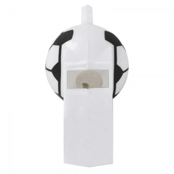Pito plástico con cordón. Colores: Blanco con motivo de balón de fútbol. Medidas: 5 cm x 1.8 cm