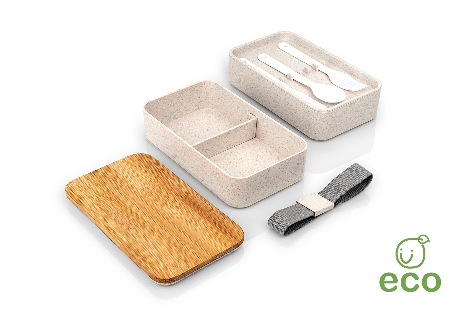 Portacomidas de dos secciones paja de trigo con tapa en bambú y banda en silicona, incluye tenedor, cuchara y cuchillo