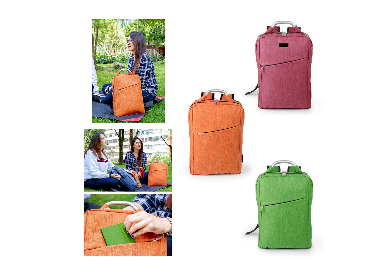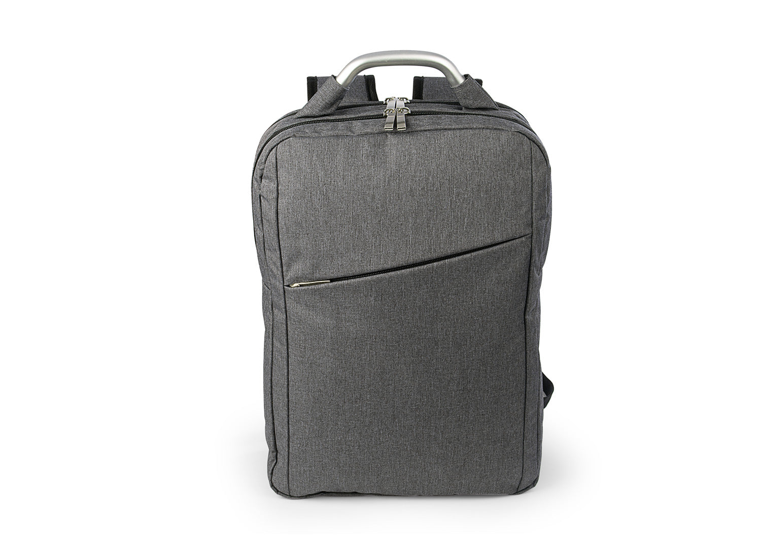 Morral con agarradera en Aluminio y cargaderas acolchadas, 2 bolsillos principales con doble cremallera, uno con compartimento con velcro para portátil de 14" y el otro con bolsillo interior para bolígrafo y libreta.