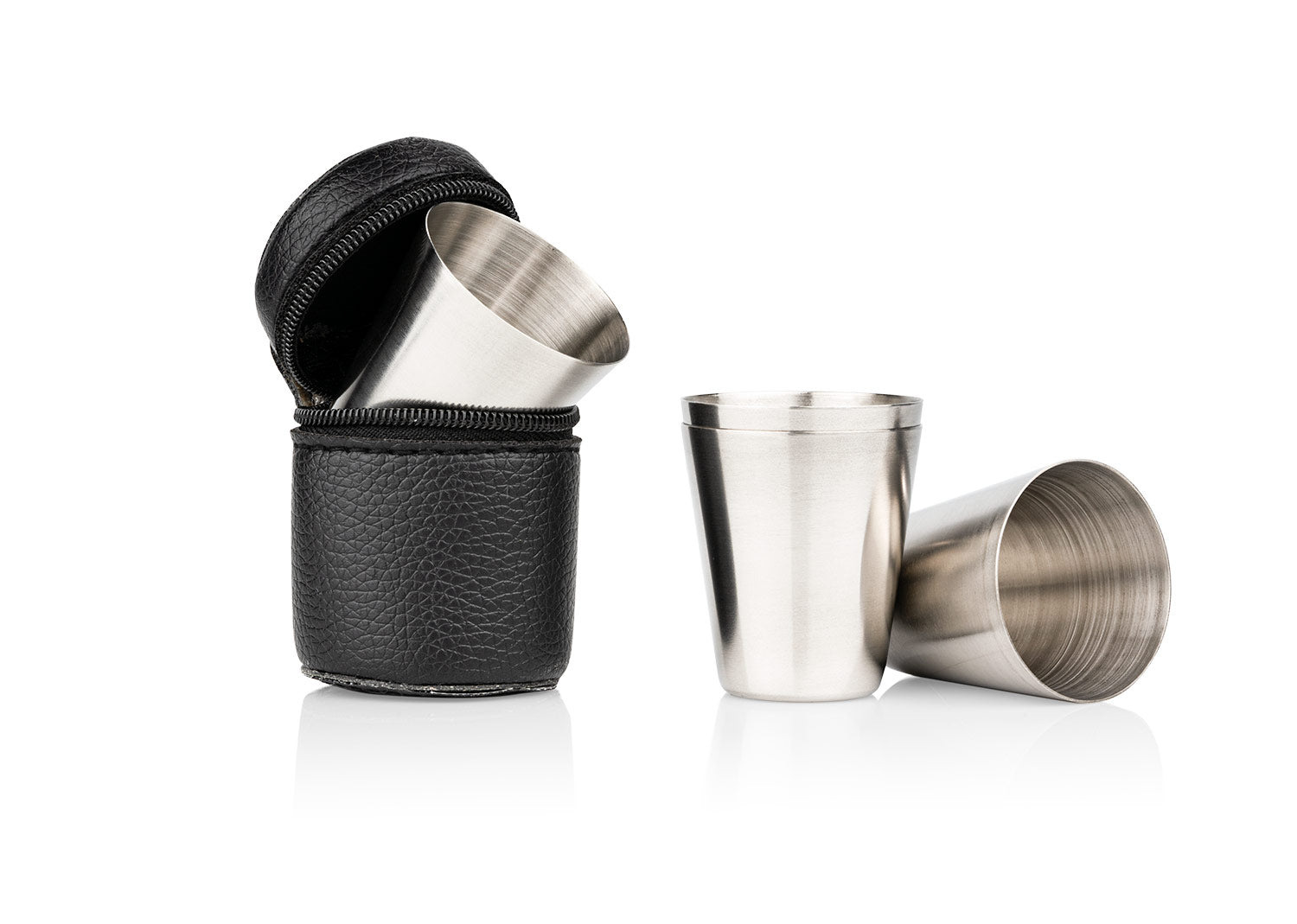 Set de 4 copas en acero inoxidable con práctico y llamativo estuche tipo cuero para transportar. Capacidad 30 ml.