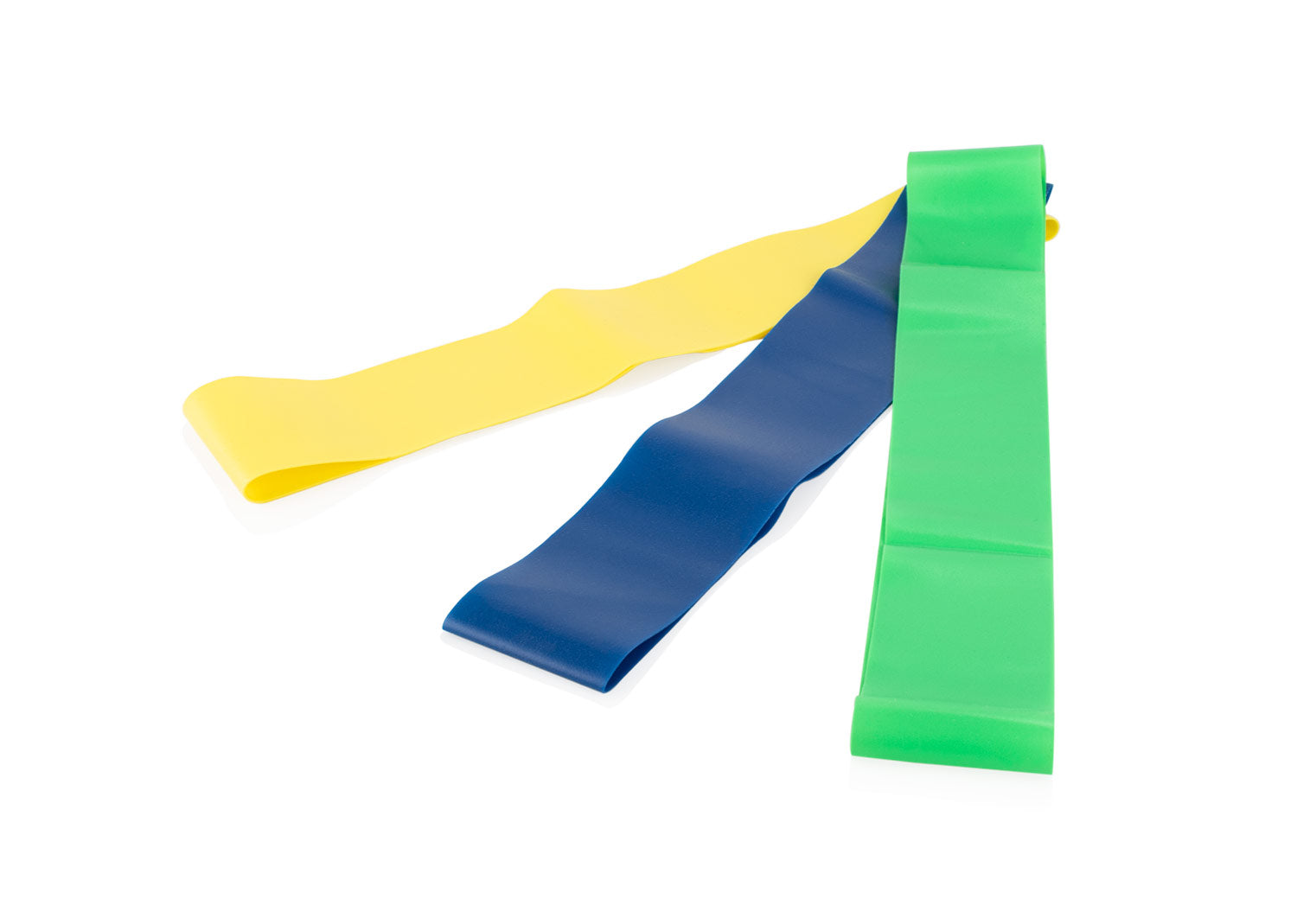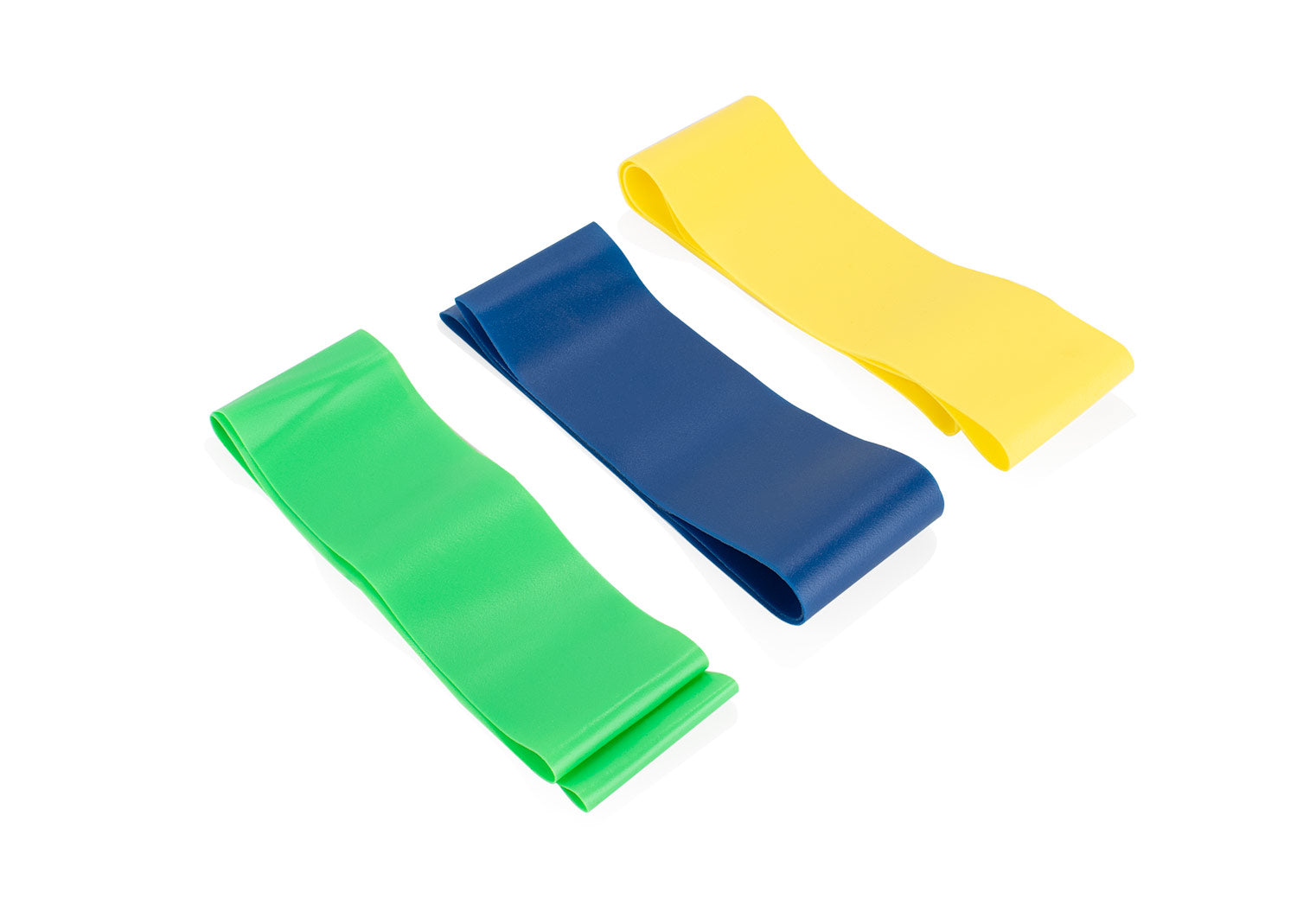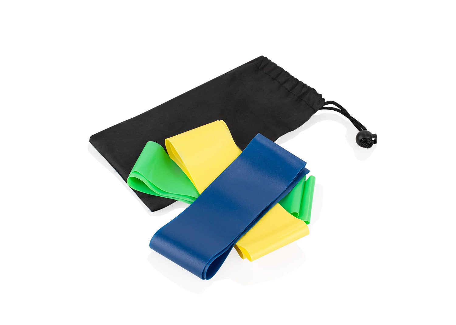 Set de tres bandas de resistencia fabricadas en TPE: Azul: (5 X 29,7 X 0,1). Verde: (4,7 X 31,2 X 0,1). Amarilla: (5 X 30,7 X 0,1), ideales para ejercitarse. Empacadas en Tula.