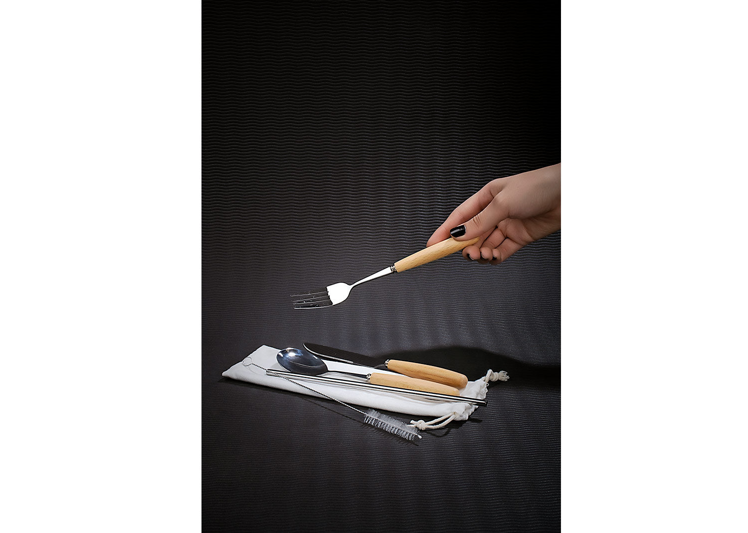 Set de Cubiertos en Acero inoxidable con mango en bambú, Bolsa de algodon para guardar, incluye Tenedor, Cuchara, Cuchillo y Pitillo con cepillo para limpiarlo. Sugerencias de cuidado y limpieza de pitillos: Dejar sumergido en agua con sal, durante dos horas y antes de su primer uso.