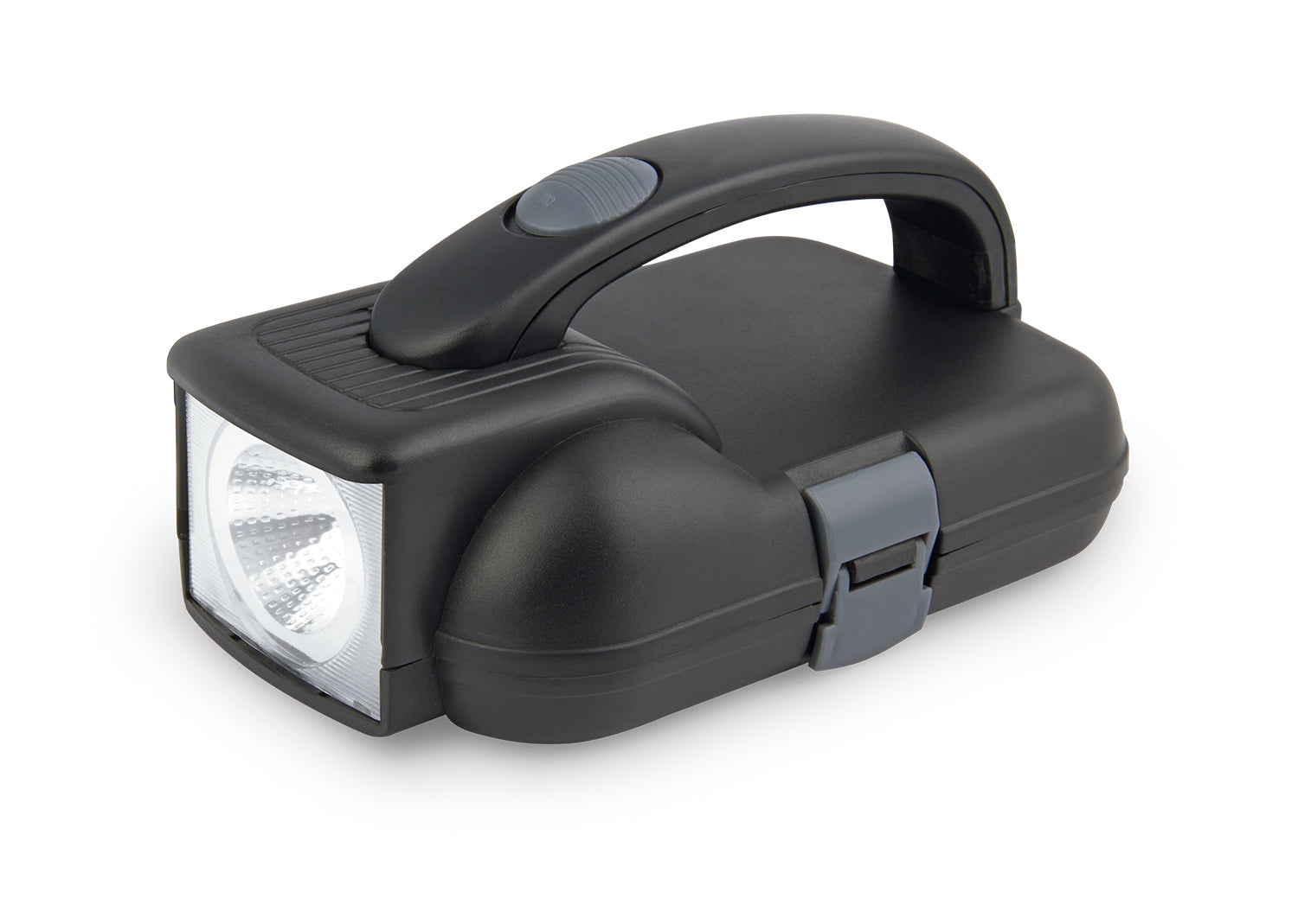 Caja de herramientas con linterna externa (4 pilas AA no incluidas). Incluye ratchet, 8 copas estándar, 10 puntas de destornillador, 4 destornilladores de precisión, un portapuntas magnético.
