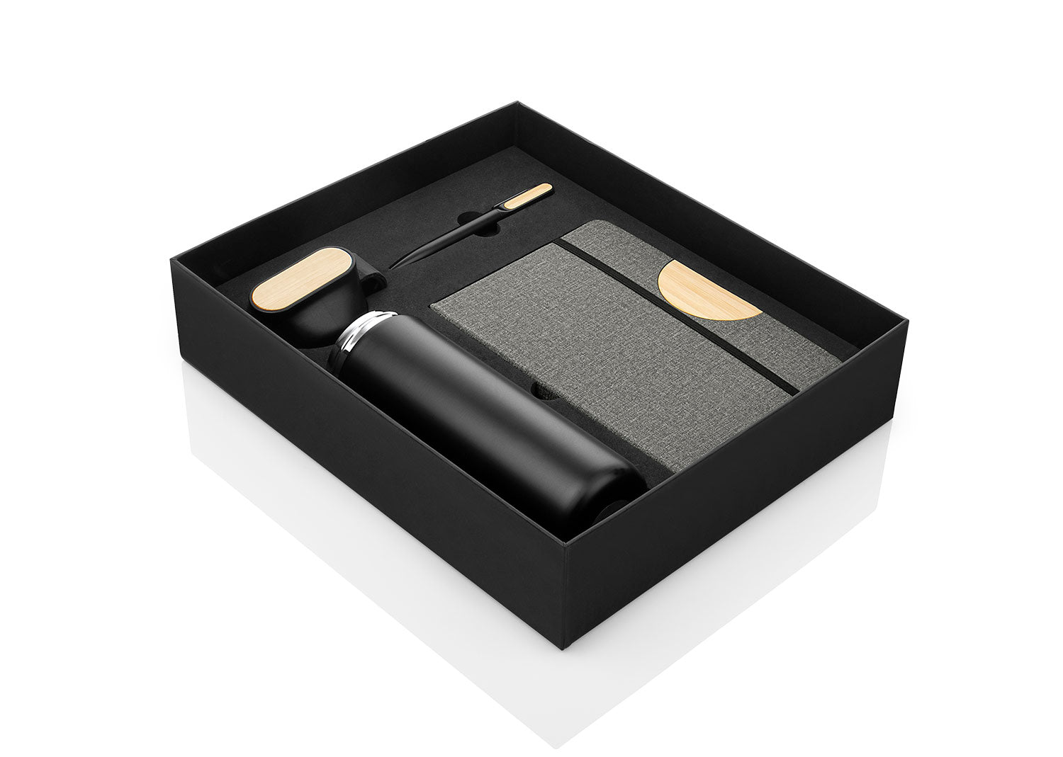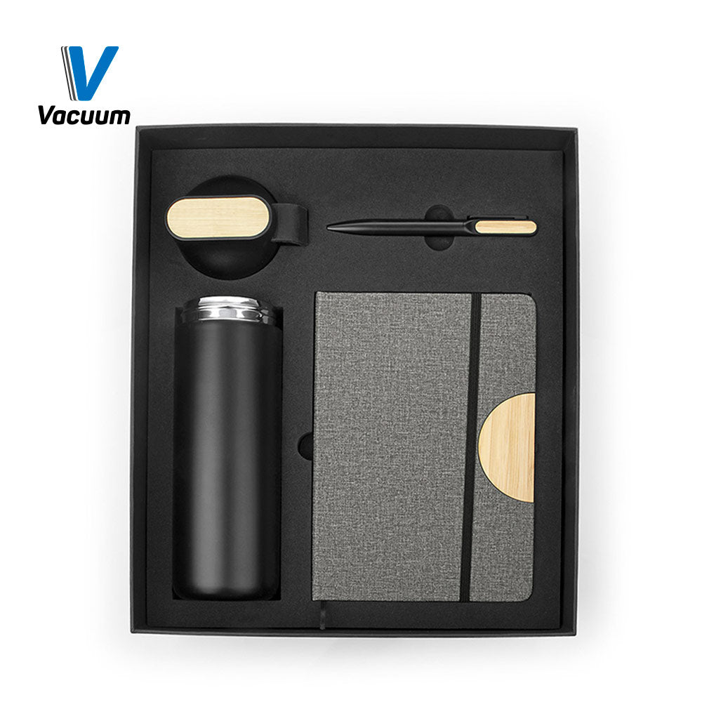 Set ejecutivo con estuche de lujo. Incluye bolígrafo en aluminio con sistema twist, Libreta con 80 hojas rayadas, banda elastica de cierre lateral, cinta marcadora y portabolígrafo. Mug de 600 ml con tapa de Bambú / 20 Oz en acero inoxidable con tapa rosca y banda de silicona para transportar con facilidad.