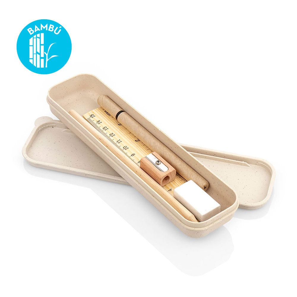 Set de escritorio en estuche en Paja de trigo”. Incluye bolígrafo con tapa y tinta negra, borrador, 2 lápices, tajalápiz y regla de 15 cm / 6 pulgadas.
