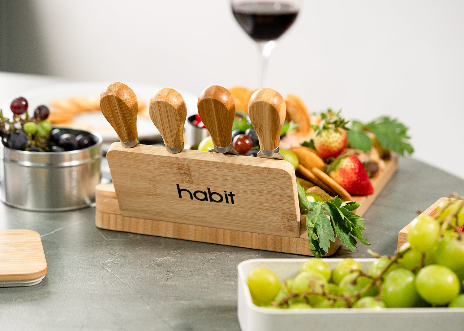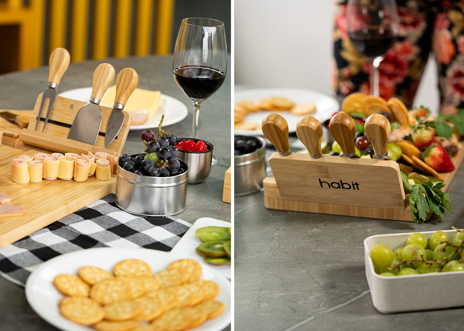 Tabla de quesos rectangular imantado con 4 Utensilios: Cuchillo para parmesano, Tenedor, quesos blandos y quesos duros. Lavar con agua y jabón y secar al aire libre.